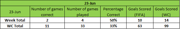 A good day for FIFA, some bold predictions did not come through. It was a day with few surprises, not a good day for bold predictions. FIFA is also showing conservative numbers in the goals department, with a huge and widening gap. Let’s see how the rest of the group stage plays out.